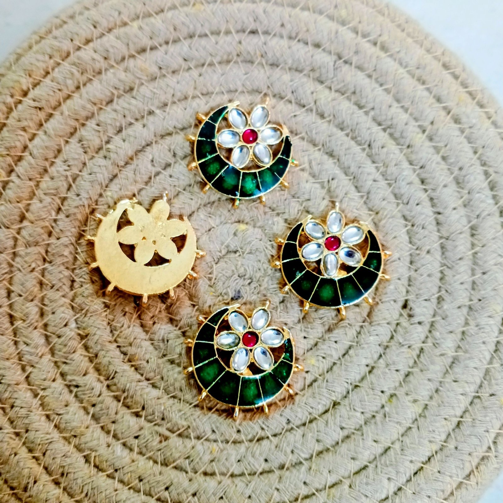 Each piece includes integrated loops, perfect for hanging pearls, beads, or enamel drops.Ideal for creating statement earrings (Jhumkas/Chandbalis), choker centers, or ornate bridal maang tikkas.