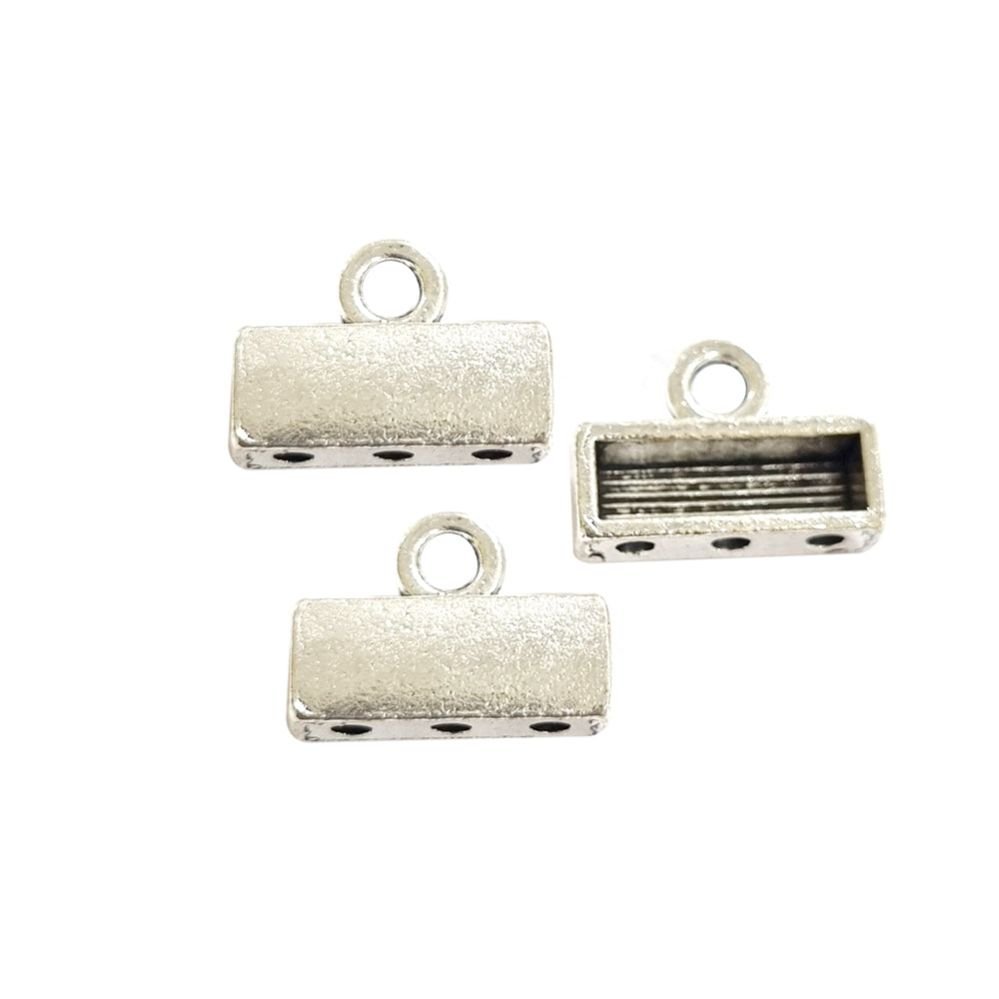 This 3-hole silver-tone end bar connector is a practical jewelry finding used to neatly finish multi-strand designs. It features a rectangular end cap with three evenly spaced holes for securing cords, chains, or wires, and a top loop for easy attachment to clasps or jump rings.