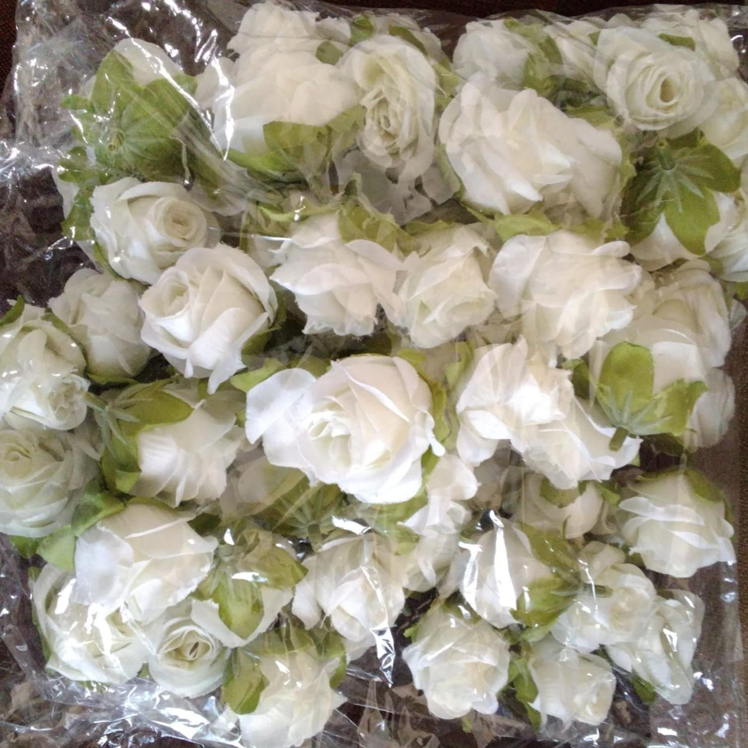 These artificial rose flowers feature beautifully crafted white rose blooms with soft, layered petals and natural-looking green sepals. Designed to closely resemble real roses, they offer a fresh, elegant appearance without the need for watering or maintenance. The flowers are neatly packed in transparent plastic, making them easy to store and handle.
