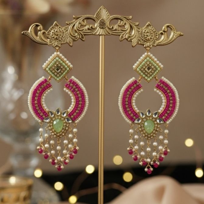 These stunning earrings are a prime example of handcrafted artistry with a traditional, festive appeal. They are designed as elaborate statement pieces perfect for weddings, mehendi ceremonies, or formal celebrations.